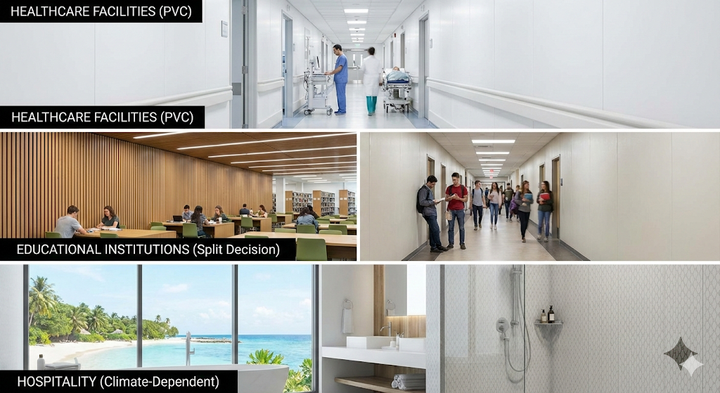 Primary Applications: PVC dominates in high-moisture environments including healthcare facilities, commercial kitchens, institutional bathrooms, exterior applications, and any setting requiring frequent deep cleaning or sanitization. Geographic markets with extreme humidity or temperature fluctuations heavily favor PVC for dimensional stability.